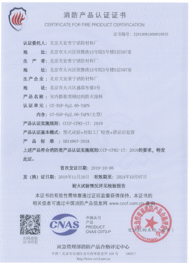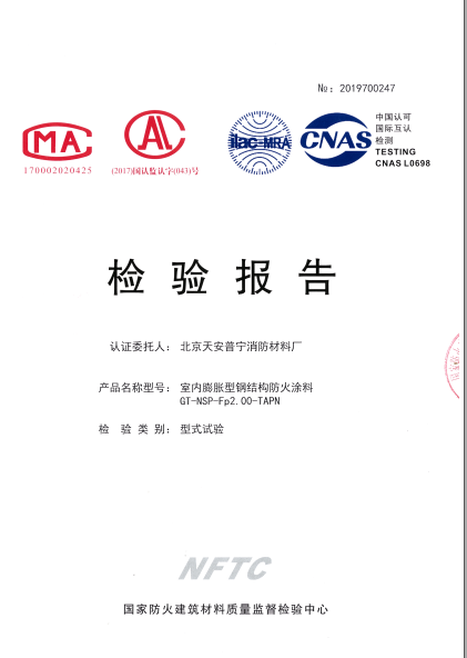 GT-NSP-TAPN室內膨脹型鋼結構防火涂料經《國家固定滅火系統(tǒng)和耐火構件質量監(jiān)督檢驗中心》按GB14907-2018《鋼結構防火涂料通用技術條件》標準檢驗,理化性能合格,耐火極限最高可達2.0h。該涂料具有附著力強,耐久性長,涂層薄、耐火極限高、易施工等優(yōu)點。涂層遇火迅速膨脹,涂層形成海綿狀較厚實的防火隔熱層,使鋼結構遇到火災時不易變彎曲和坍塌,延長鋼結構耐火時間達到防火效果。 產品組成: 防火材料:聚磷酸氨,三聚氰胺,季戊四醇,氯化石蠟,鈦白粉等;粘結劑;丙烯酸樹脂,氨基樹脂、100A溶劑;不含石棉、甲醛及苯類等揮發(fā)性有害物質。 應用范圍:可適用于建筑工程中各種鋼構件、球形網架等承重結構的防火保護