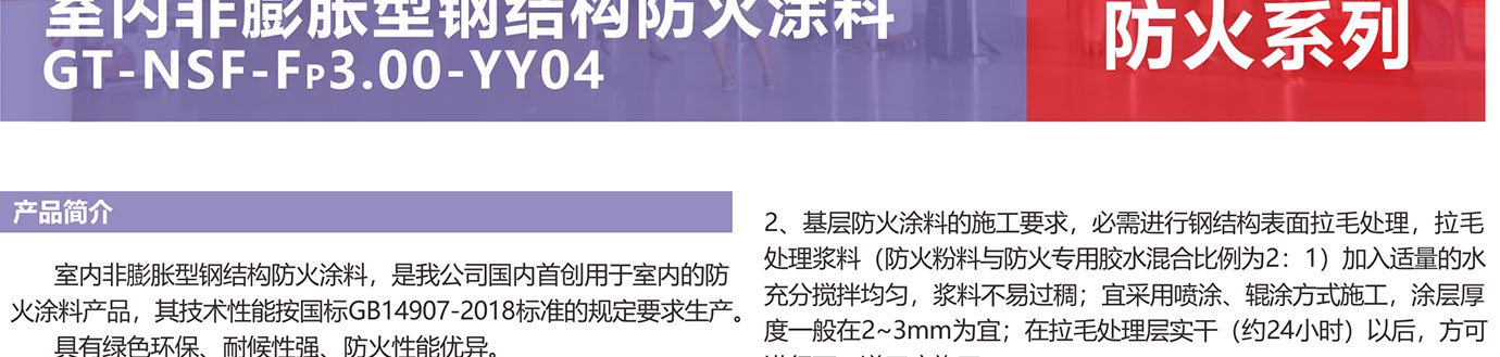 室內(nèi)外非膨脹型鋼結(jié)構(gòu)防火涂料,是我公司國內(nèi)首創(chuàng)用于室內(nèi)的防火涂料產(chǎn)品,其技術(shù)性能按國標(biāo)GB14907-2018標(biāo)準(zhǔn)的規(guī)定要求生產(chǎn)。 具有綠色環(huán)保、耐候性強(qiáng)、防火性能優(yōu)異。 應(yīng)用范圍:高層鋼結(jié)構(gòu)建筑、工業(yè)鋼結(jié)構(gòu)廠房、機(jī)場火車站、石油化工、防火墻、體育場館等室內(nèi)鋼結(jié)構(gòu)框架的梁、柱防火保護(hù)。